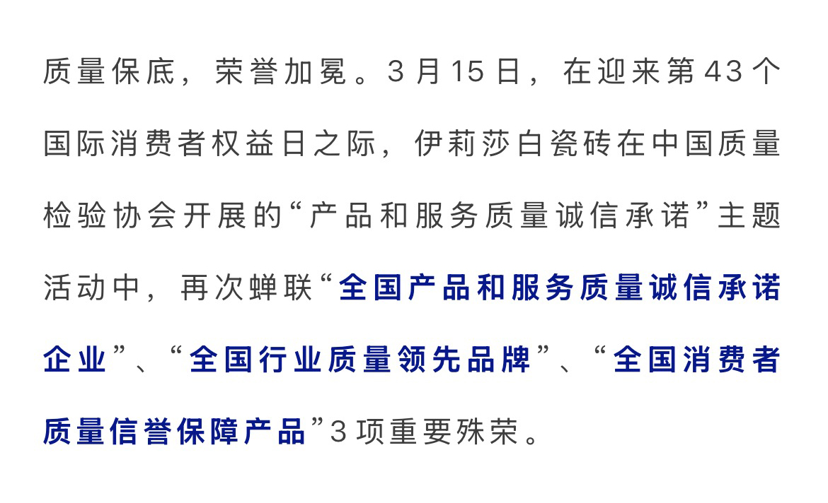Shining星耀時(shí)刻 | 伊莉莎白瓷磚蟬聯(lián)中國質(zhì)量檢驗(yàn)協(xié)會(huì)3項(xiàng)重要殊榮